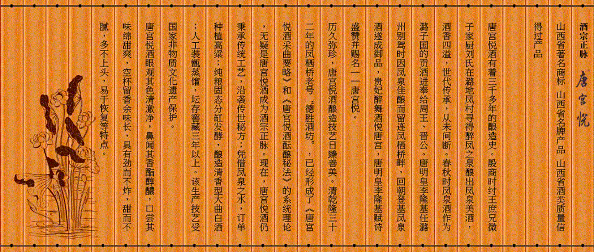 鳳棲橋釀業(yè)有限公司歷史悠久。從殷商微子家廚劉氏尋鳳泉釀酒至今,已有三千多年釀造史。劉氏后裔代傳代善, 才有唐明皇李隆基賜名“唐宮悅”,到清乾隆三十二年的鳳棲橋老號(hào)“德勝酒坊”已形成了《唐宮悅酒采曲要略》和《唐宮悅酒醞釀秘法》的系統(tǒng)理論的系統(tǒng)理論,直至建國初期的一九五二年才被當(dāng)時(shí)的潞城邊區(qū)酒坊所接管,一九七四年改邊區(qū)酒坊成立國營潞城縣酒廠,二00六年改制為現(xiàn)公司公司地處晉冀豫三省通衢素有“商賈云集旱馬頭”美譽(yù)的微子古鎮(zhèn)……【詳細(xì)